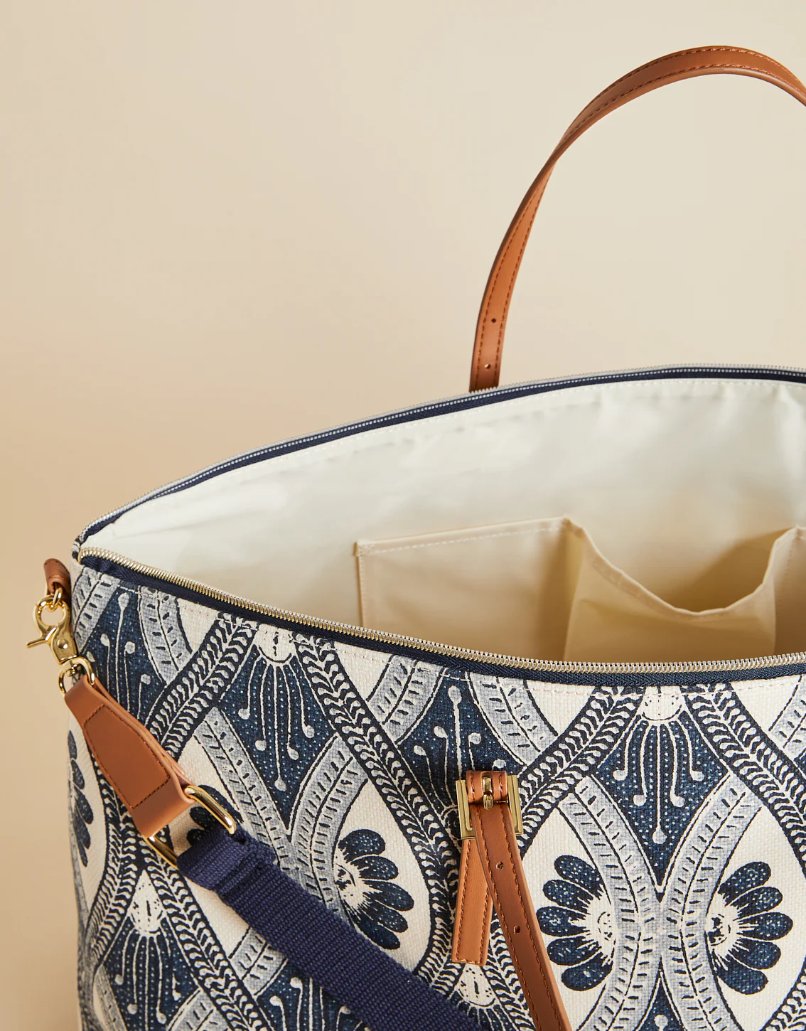 If you have jetset mindset like we do, then you need our Voyager Duffle. This zip-top is made with our signature linen and accented with our embroidered nautical logo fob. Easily carry through TSA by the faux leather handles or wear by the webbed, adjustable and detachable crossbody strap to keep things moving. The ample interior holds it all, while the convenient trolley sleeve quickly slips over the handle on your roller luggage.