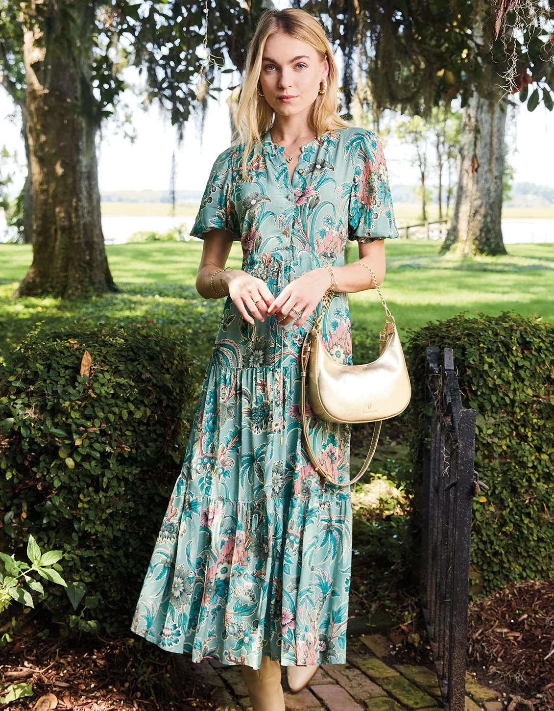 Let the breeze sweep you off your feet in our 100% Viscose, airy Lynette Dress. This short puff-sleeved, midi-length tiered skirt is made for breezy strolls through shady gardens and down sandy beaches, with side seam pockets and a split neckline.