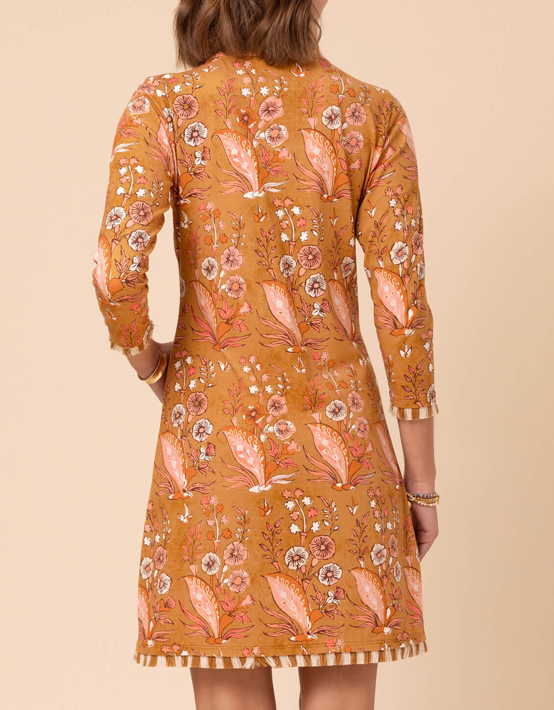 Nora Half-Zip Fringe Dress Mercer House Woodblock Floral Brown