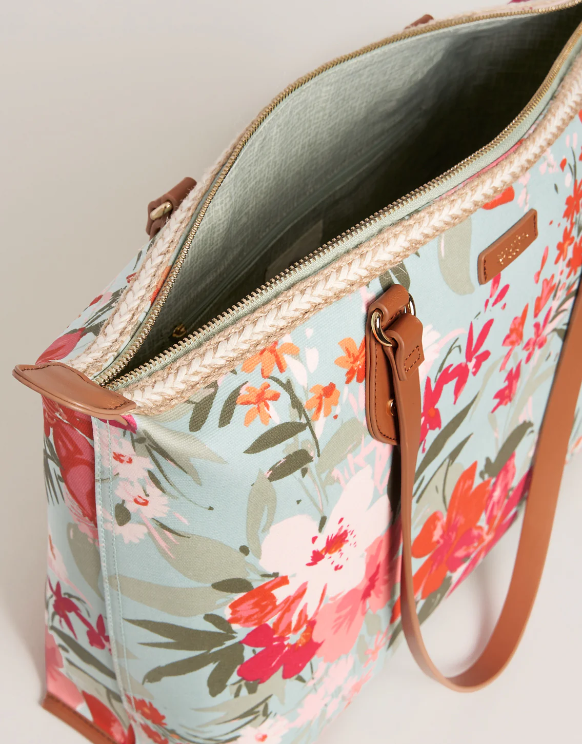 Mixing work and play? It's easy with our Alljoy Landing fabric that is laminated with an easy-to-wipe clean, splash-proof, stain-resistant coating. This Zip Travel Tote has it all. The zipper top opens to a compartment roomy enough for your laptop or tablet, while the pockets organize your AirPods and sunblock for podcasts by the pool. On the backside, this traveler's-best-friend features a zip pocket and trolley sleeve to easily carry atop your suitcase!